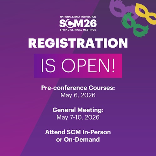 Registration for SCM26 is OPEN! Join kidney care professionals from across the country for cutting-edge education, networking, and collaboration. Attend in New Orleans or virtually On-Demand Early Bird pricing available through March 10, 2026 Register Today: NKFclinicalmeetings.org